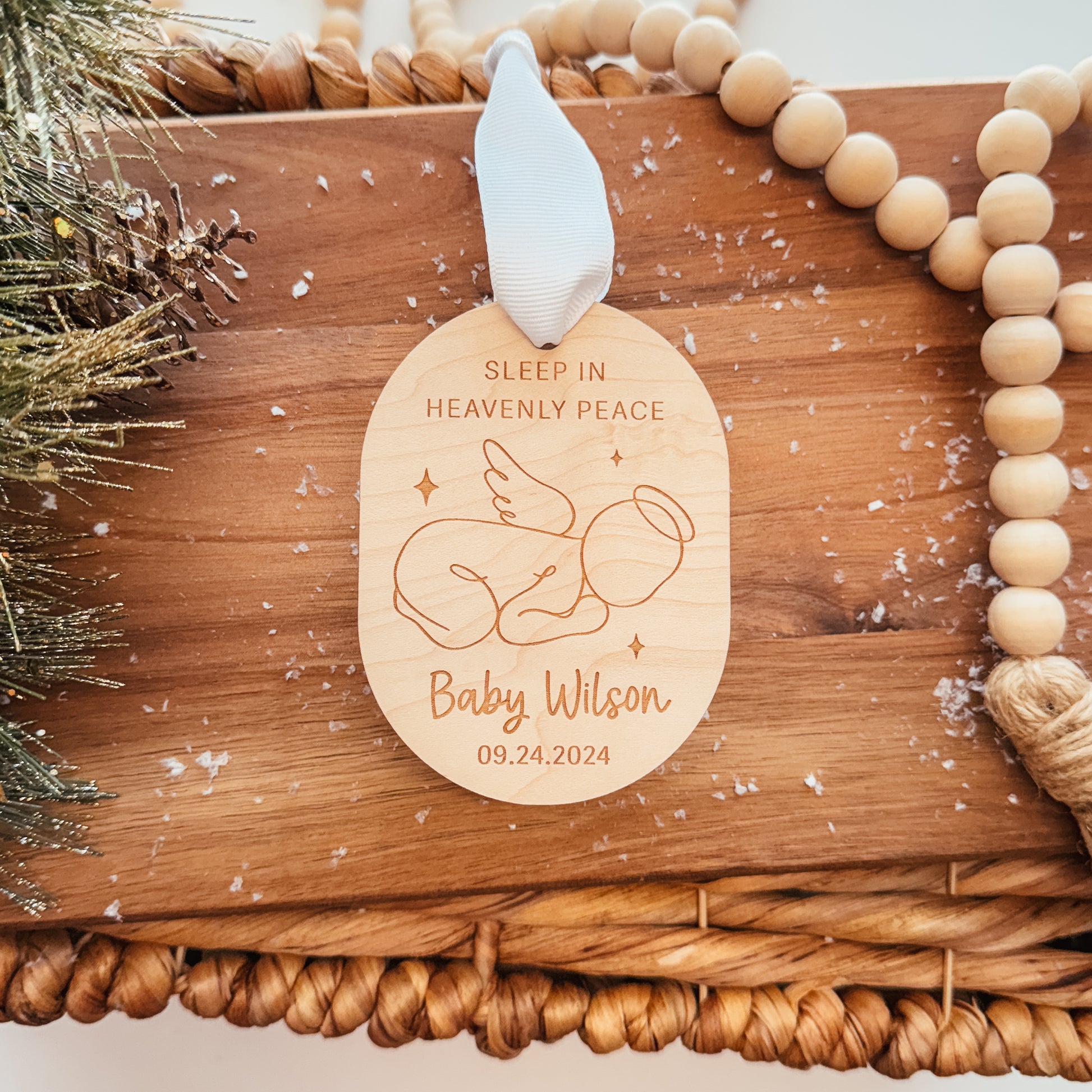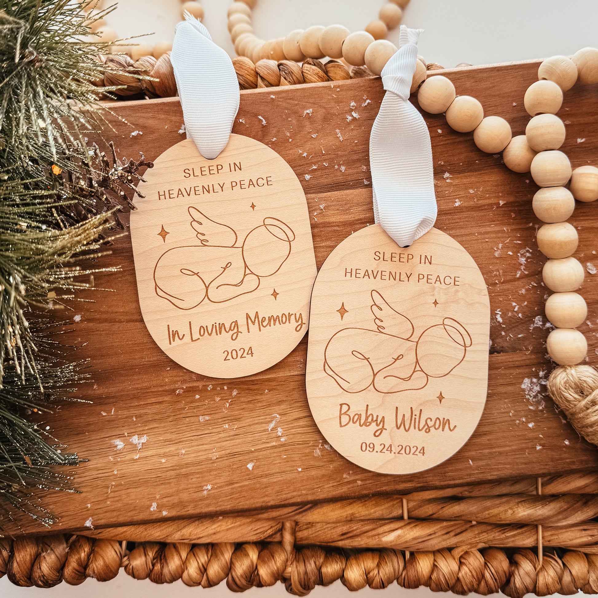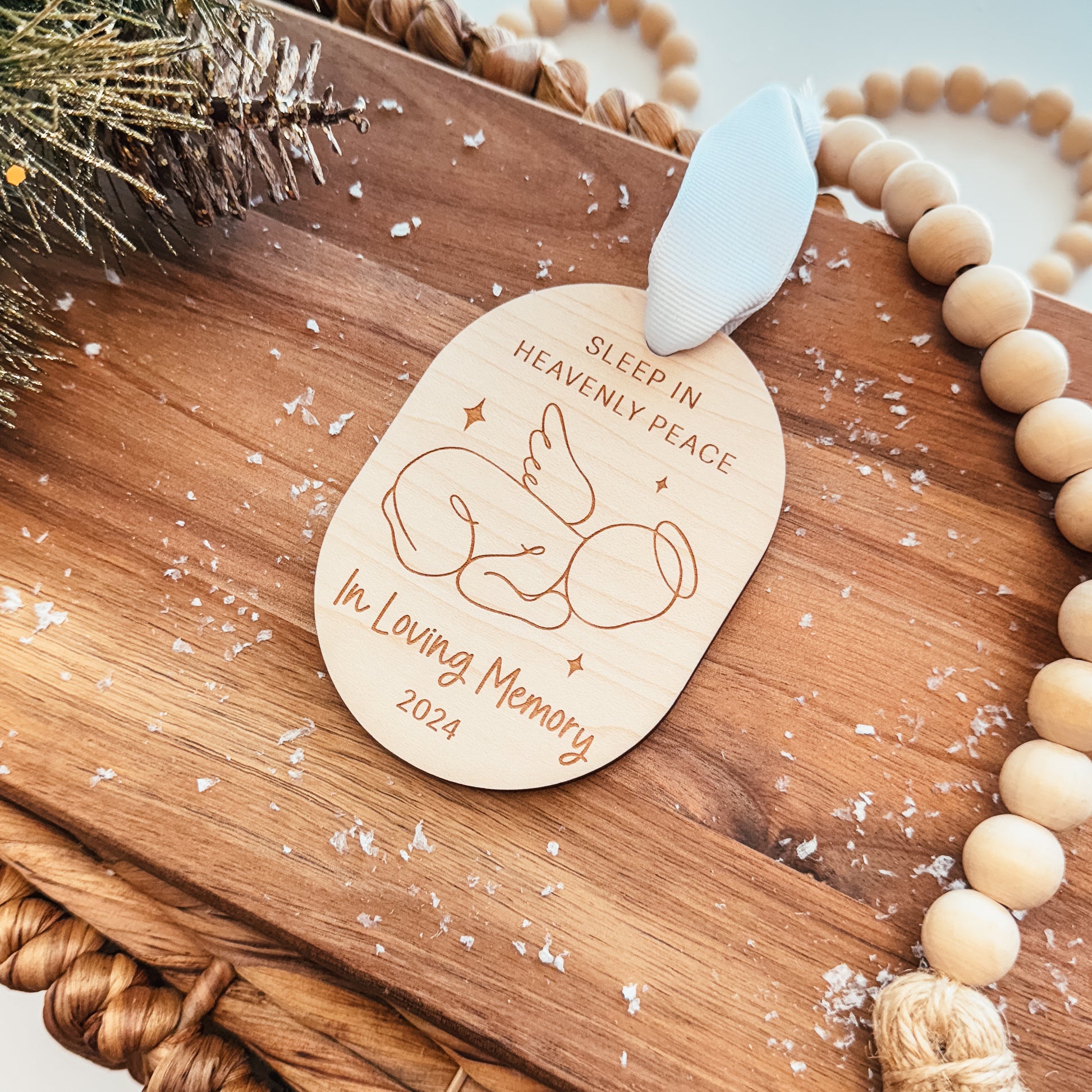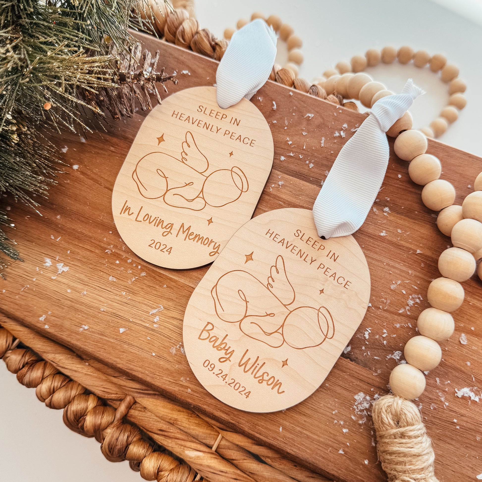 Our personalized baby memorial ornaments are designed to honour the memory of little ones lost to miscarriage or stillbirth. Each ornament is handcrafted with a lot of love to create a special keepsake or gift for those grieving loss during the holiday season.