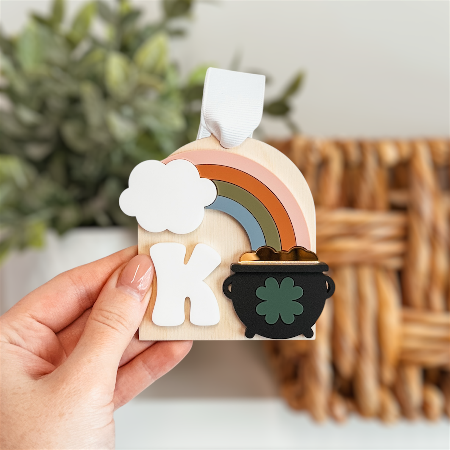 Each Shamrock rainbow tag is constructed from two laser-cut layers of wood and acrylic. The base layer of the tag is high-quality birch wood; the 3D elements and initial are cut from coloured acrylic and permanently adhered for a 3D effect. Finally the tag is finished a white ribbon for hanging.