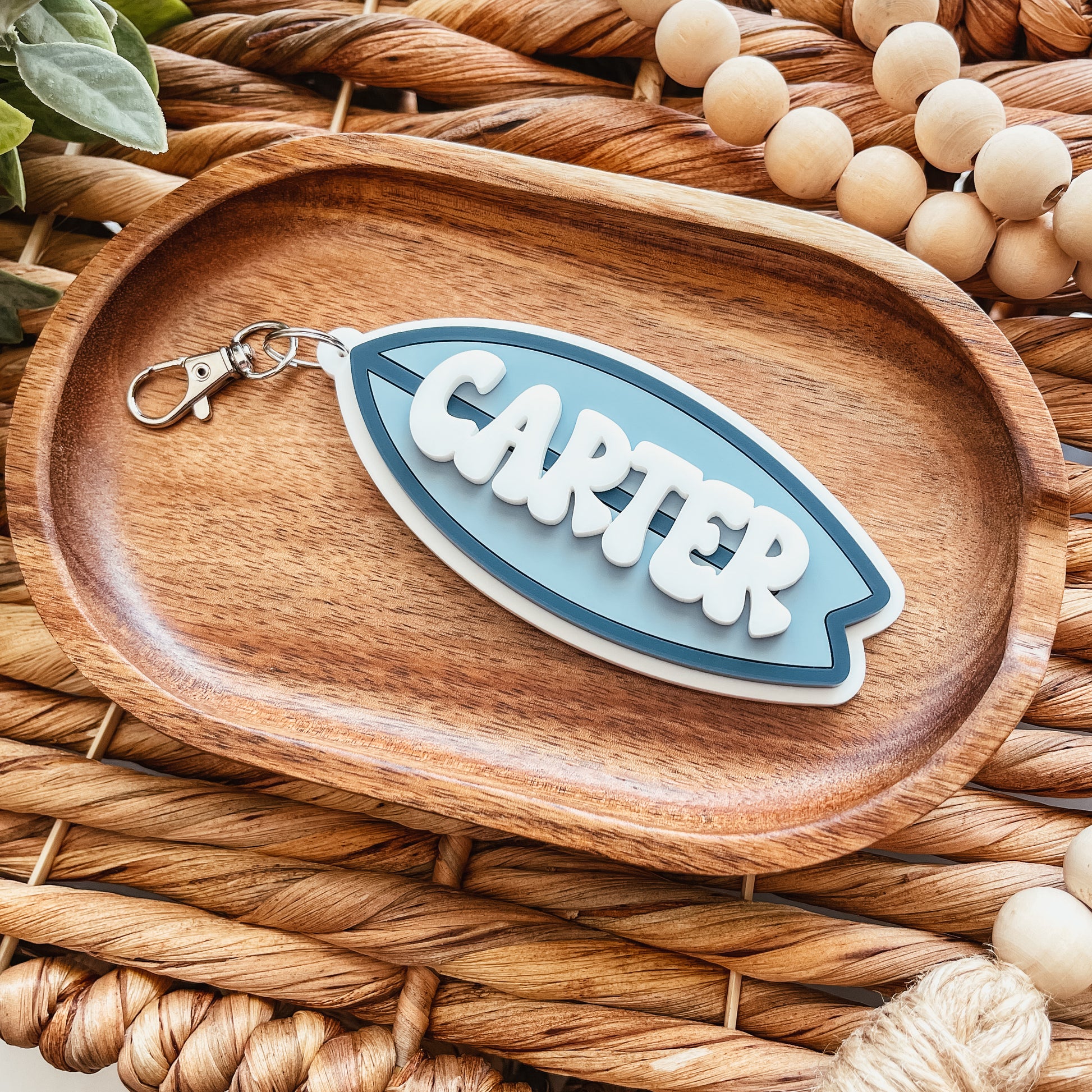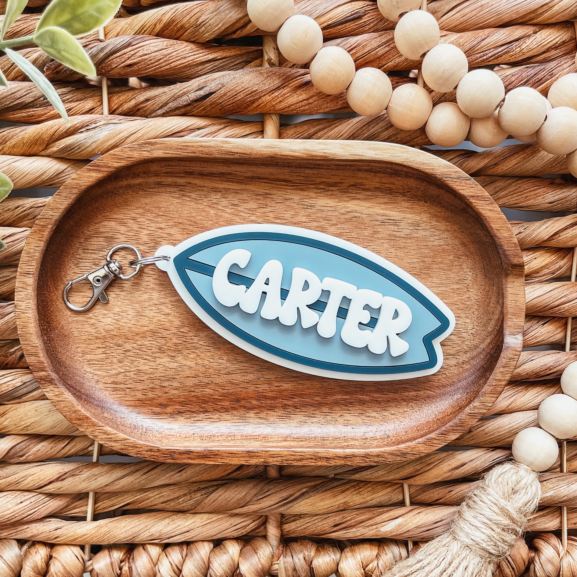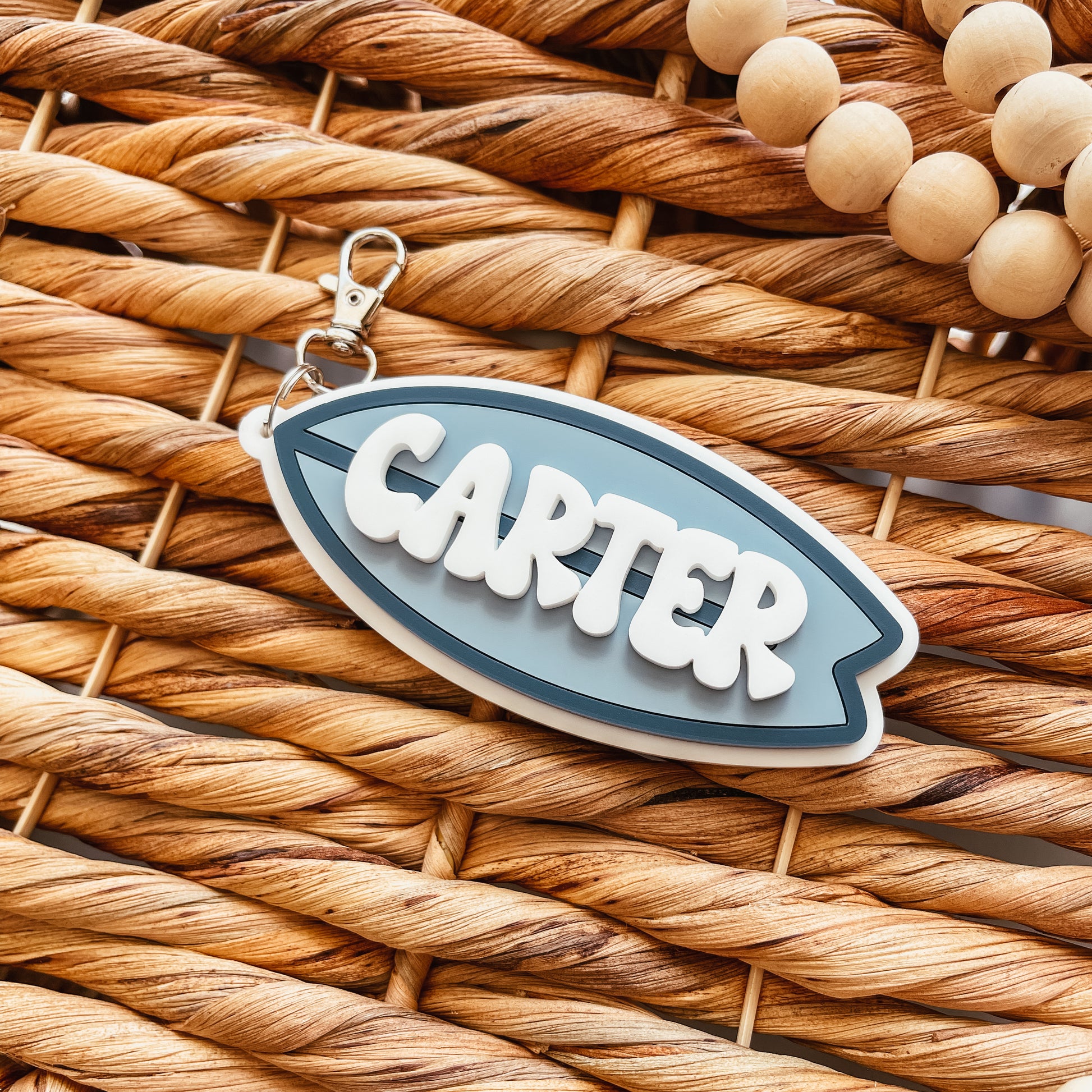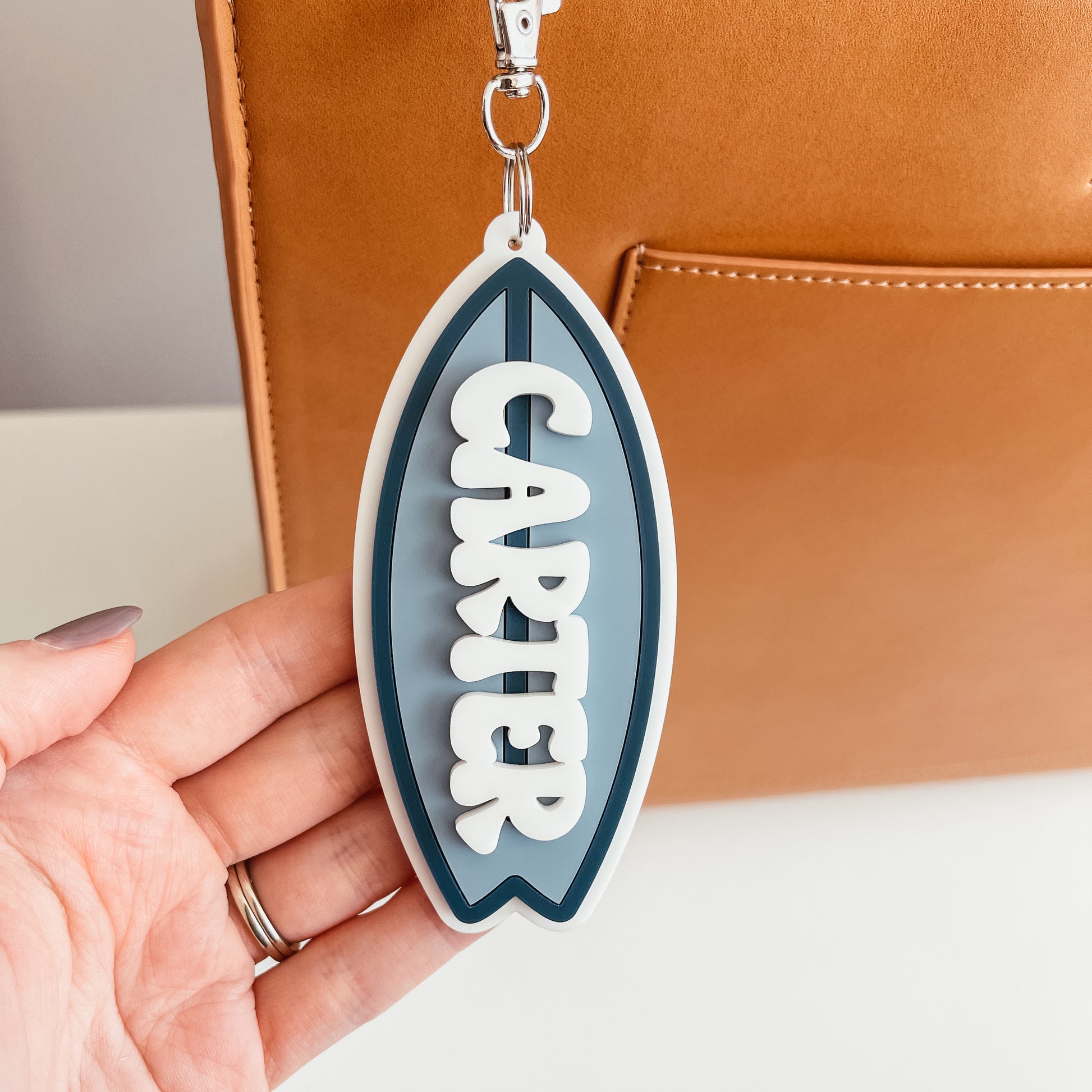 Each bag tag is cut from three layers of acrylic. The base layer is white acrylic, the surf board in the colours of your choice, and the name is in white.
