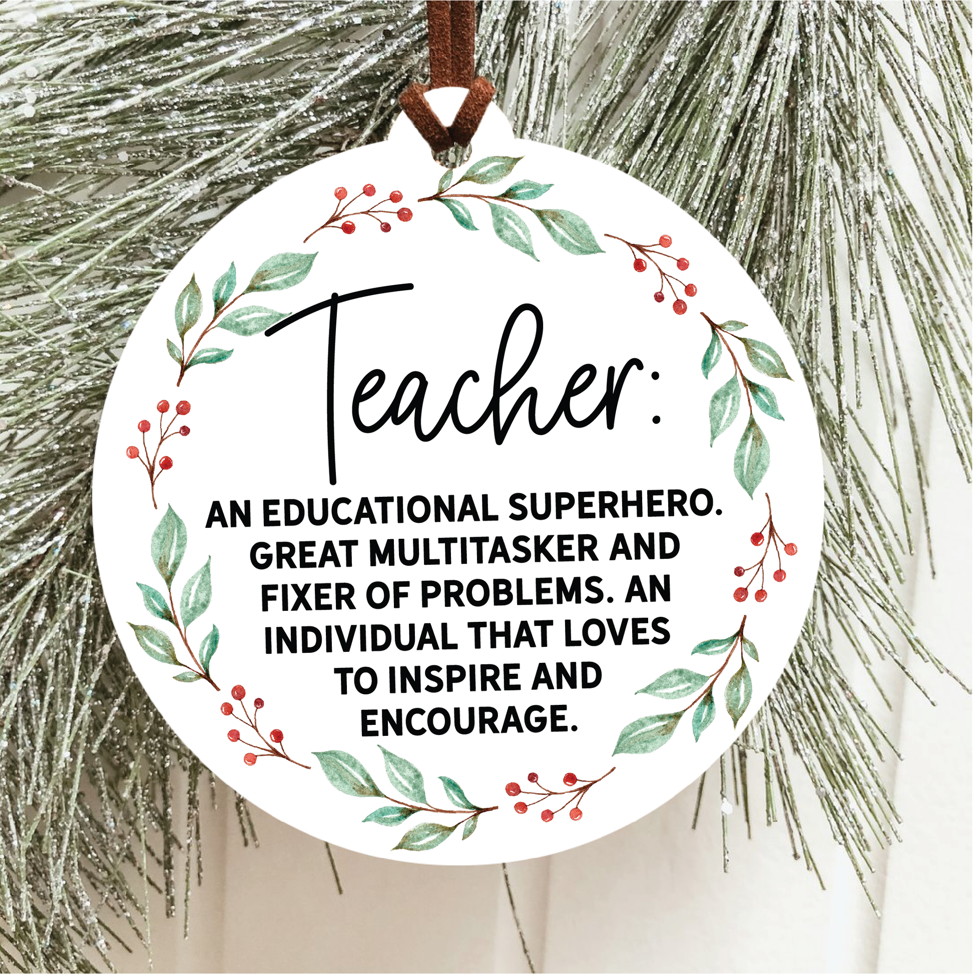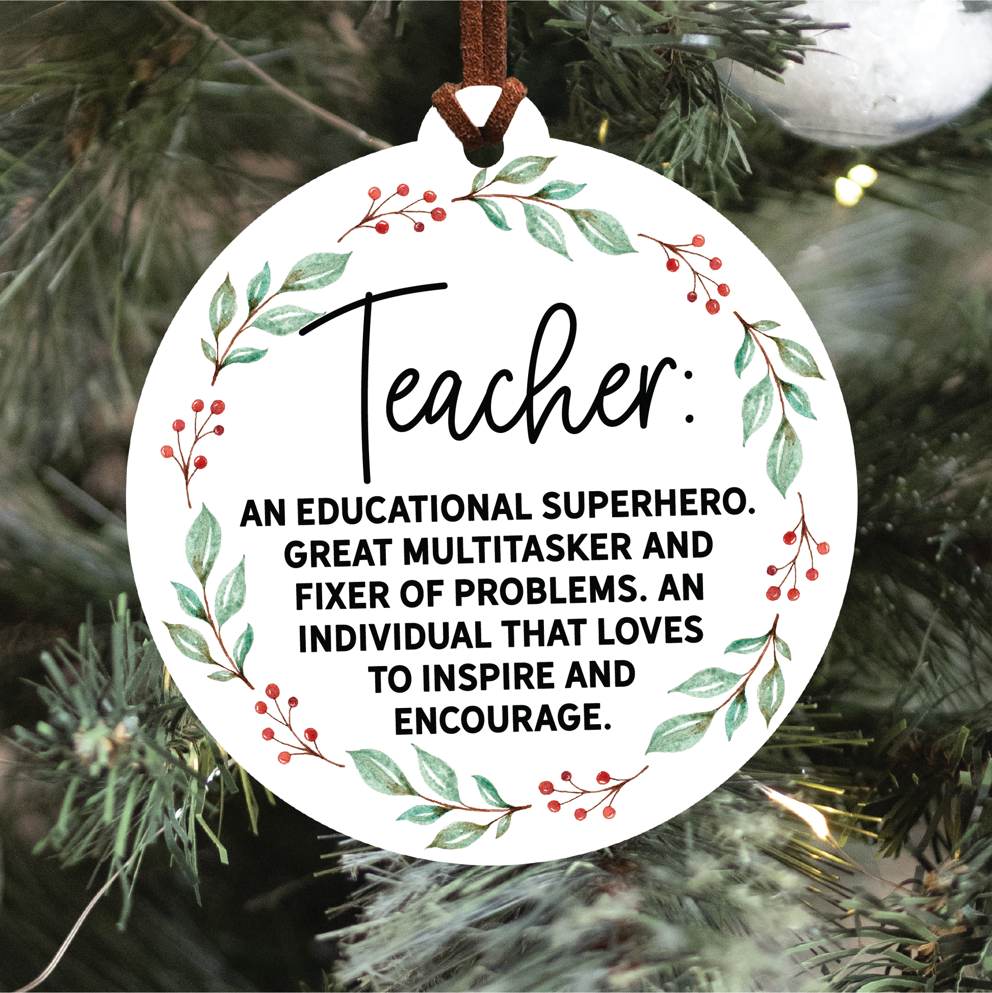 Each ornament is laser cut from 1/8" white acrylic and then printed with permanent ink. They are finished with a brown suede string for a modern look. The back of the ornament will be white.