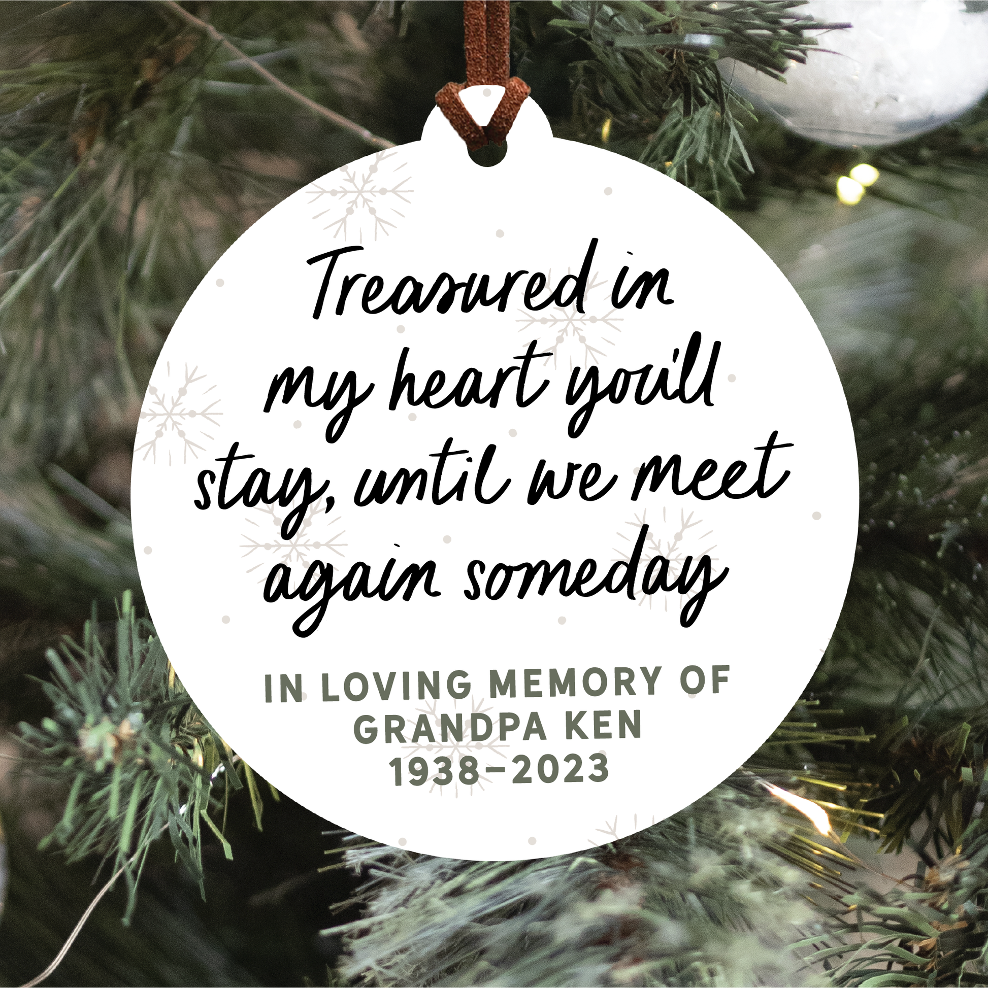 Each ornament is laser cut from 1/8" white acrylic and then printed with permanent ink. They are finished with a brown suede string for a modern look. The back of the ornament will be white.