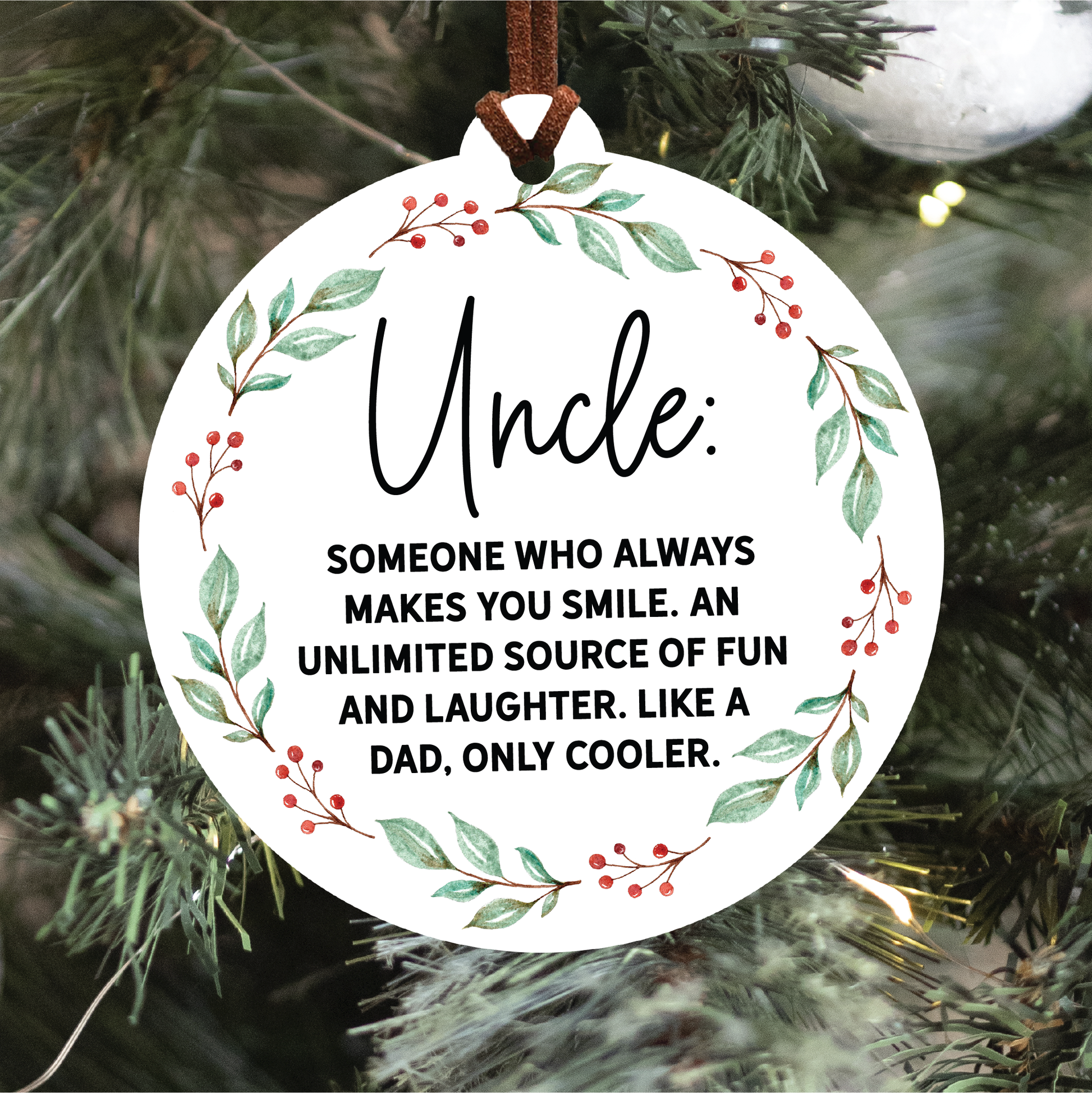 Each ornament is laser cut from 1/8" white acrylic and then printed with permanent ink. They are finished with a brown suede string for a modern look. The back of the ornament will be white.