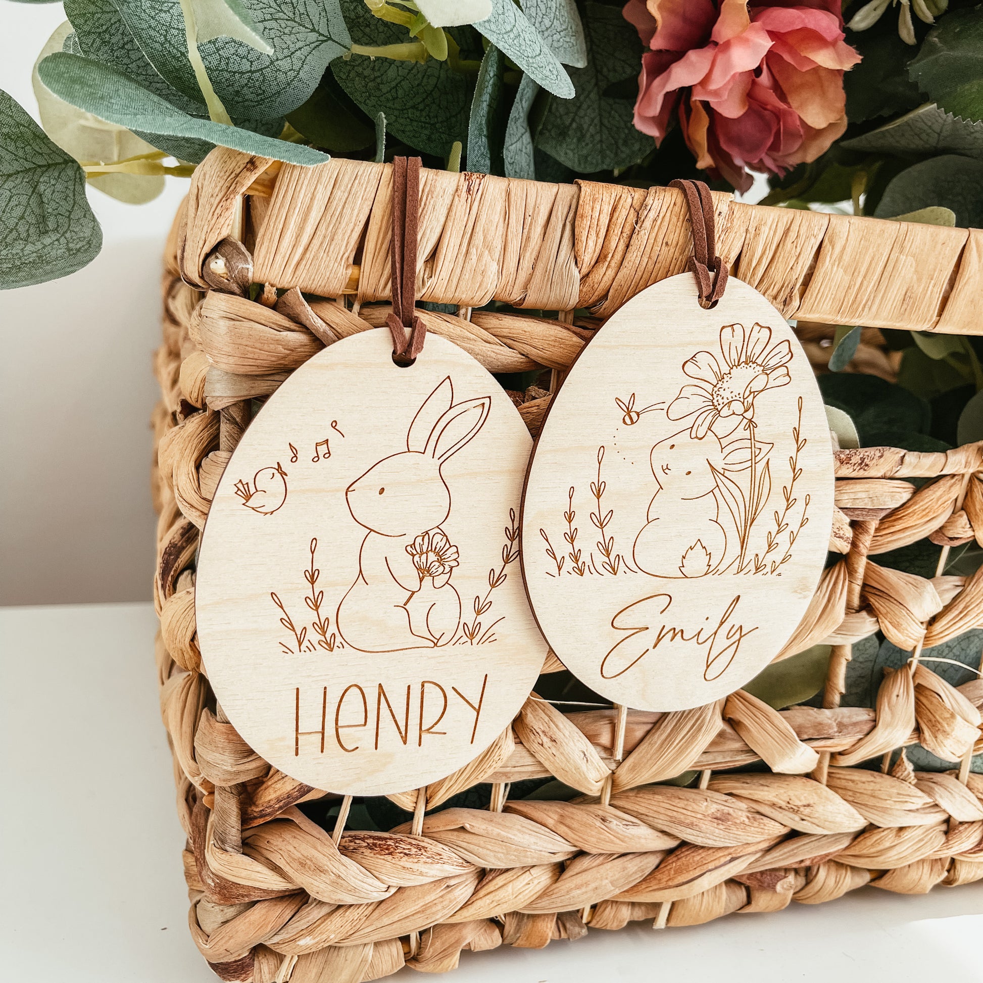 Each tag is cut from 1/8 inch high-quality baltic birch. The name is laser engraved into the wood.