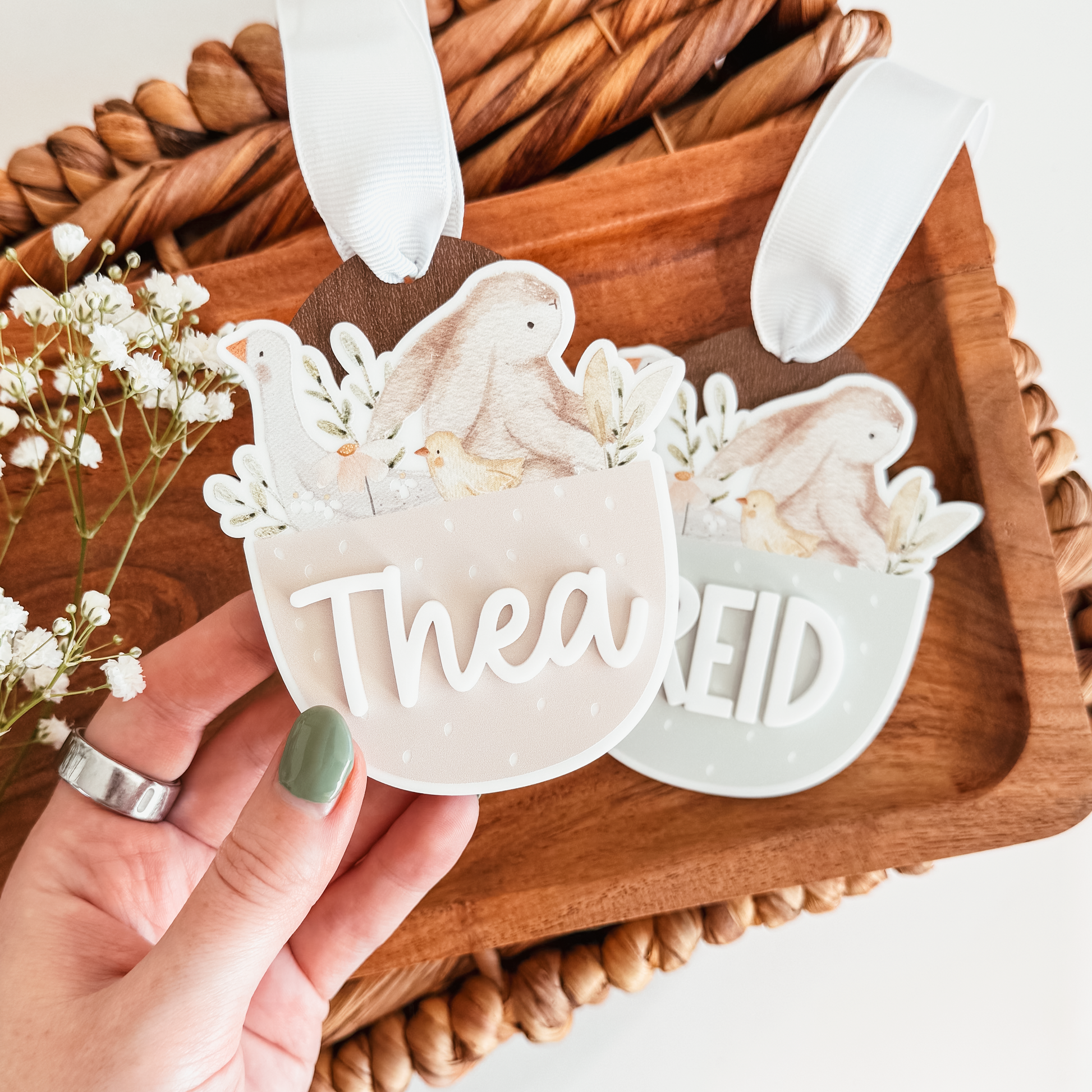 Perfect For Easter basket name tags, baby’s first Easter, spring keepsake decor, sibling basket sets, storybook or vintage-inspired Easter baskets.