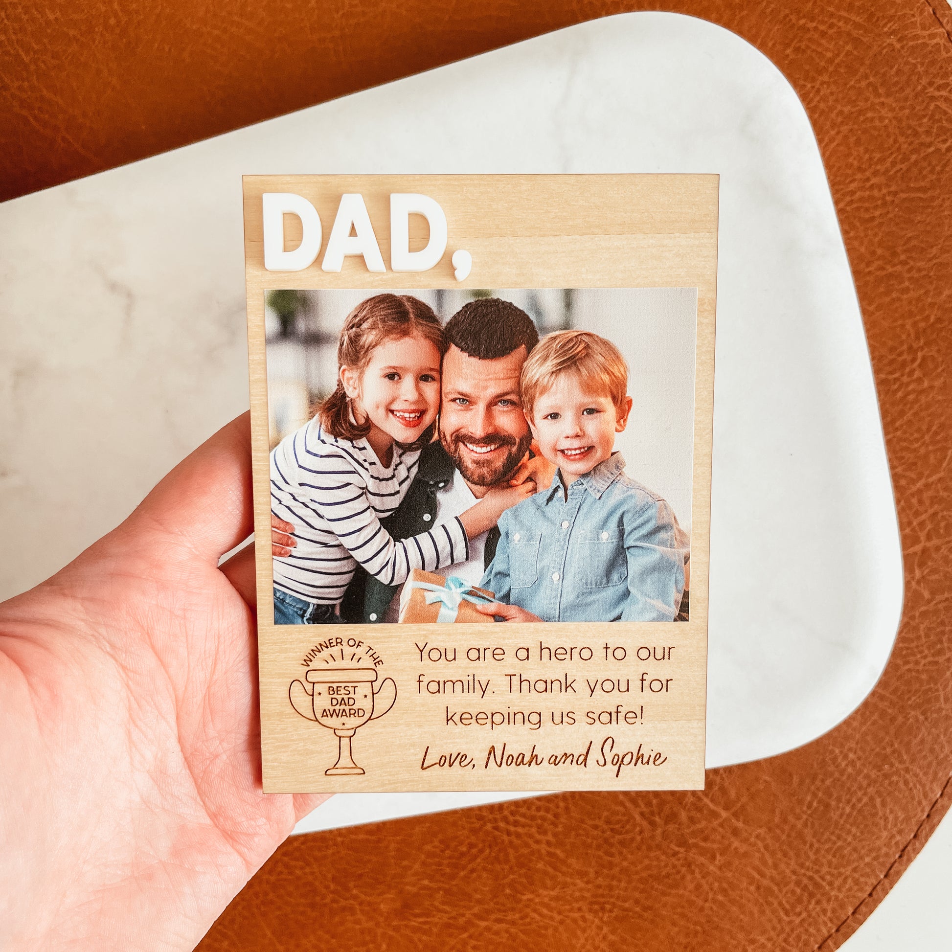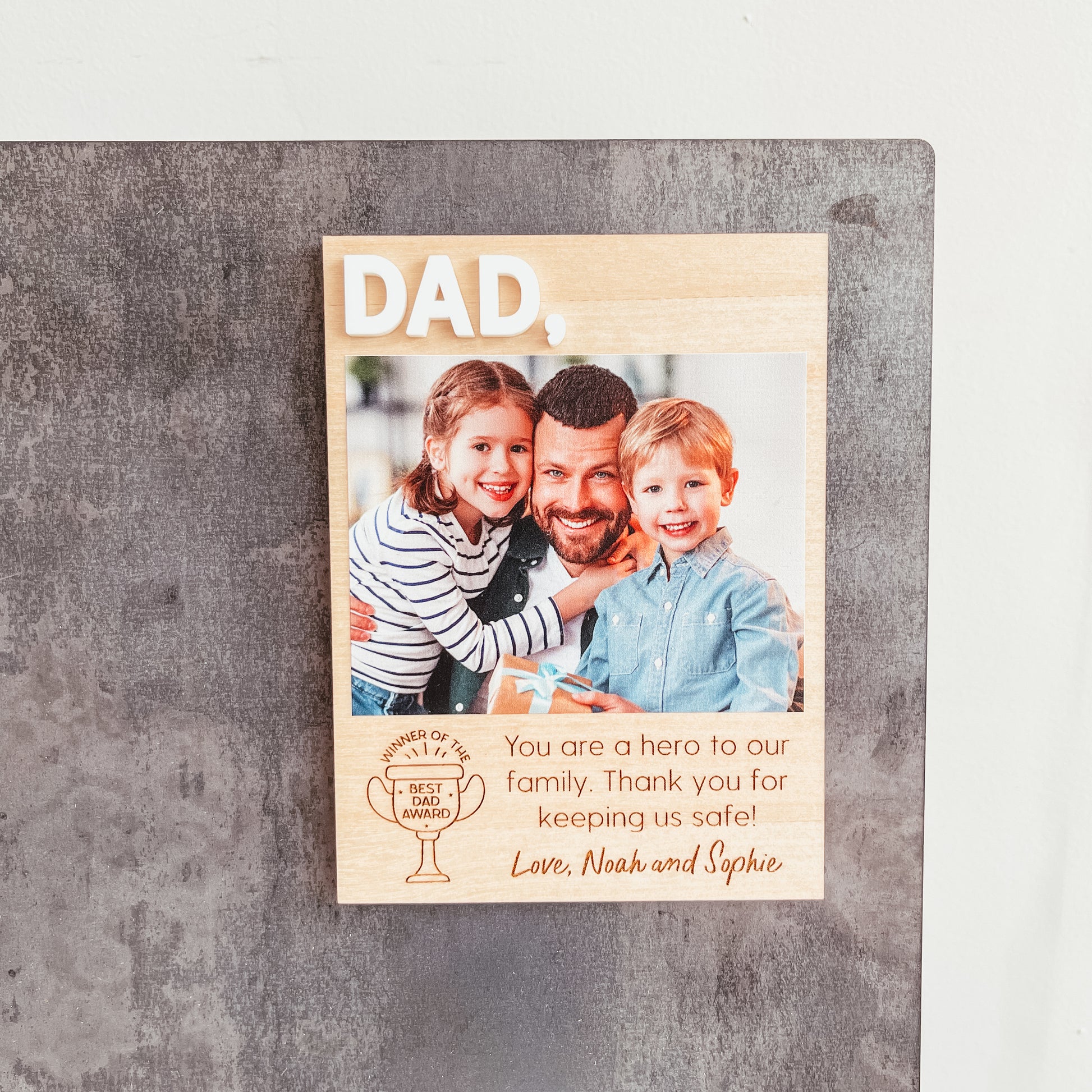 Each magnet is cut from 1/8 inch thick maple veneer and engraved. The photo is printed with ink.
